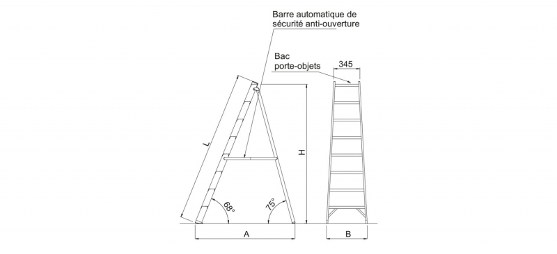 Une échelle solide indiquée pour les surfaces plates qui préfèrent les marches à la place des garde-corps, en réduisant ainsi son encombrement quand elle est rangée, mais sans renoncer au pratique bac porte-objet.