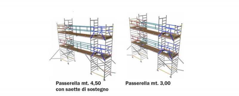 Disponibili con lunghezza fino a 5,5 mt. e con larghezza da 0,74 a 1,35 mt. le passerelle Alupont per il collegamento tra torri, sono indicate per impieghi di lavoro sulla lunghezza anche ad altezze elevate, di facile applicazione possono essere posizionate ogni 30 cm. in altezza e in corrispondenza di montanti di passaggio intermedi alle torri.